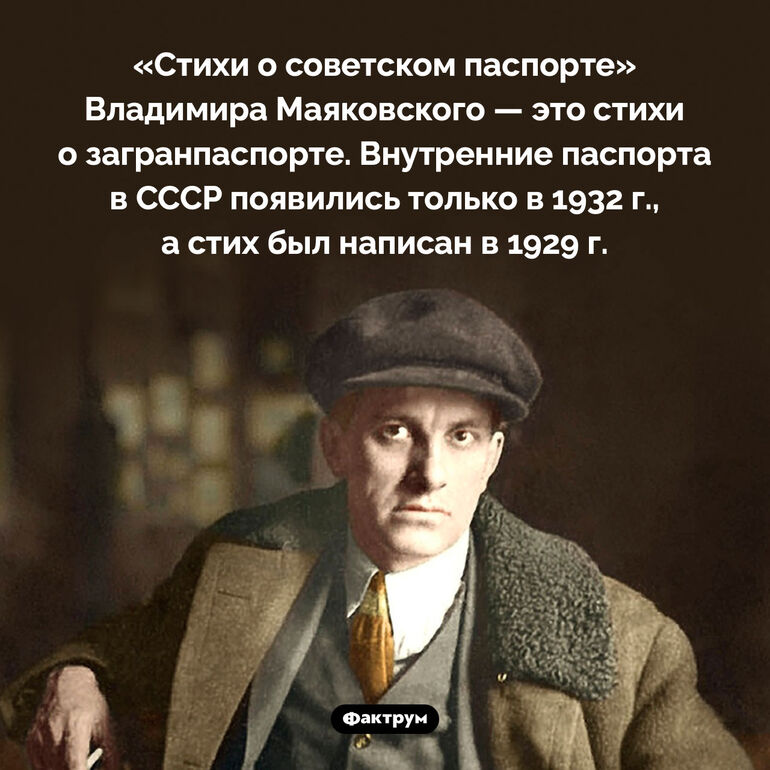 «Стихи о советском паспорте» Владимира Маяковского — это стихи о загранпаспорте. Внутренние паспорта в СССР появились только в 1932 г., а стих был написан в 1929 г.