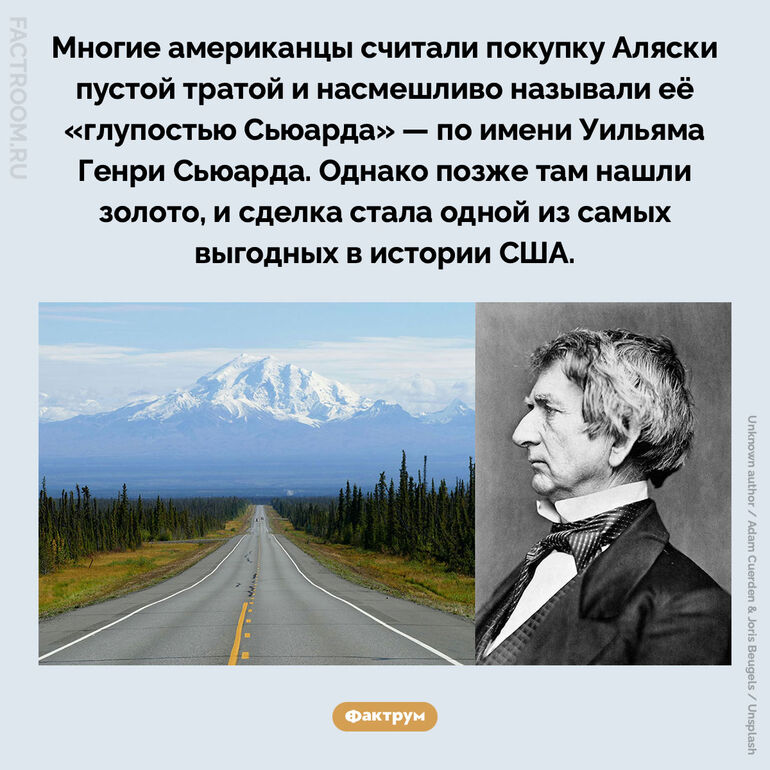 Многие американцы считали покупку Аляски пустой тратой и насмешливо называли её «глупостью Сьюарда» — по имени Уильяма Генри Сьюарда. Однако позже там нашли золото, и сделка стала одной из самых выгодных в истории США.