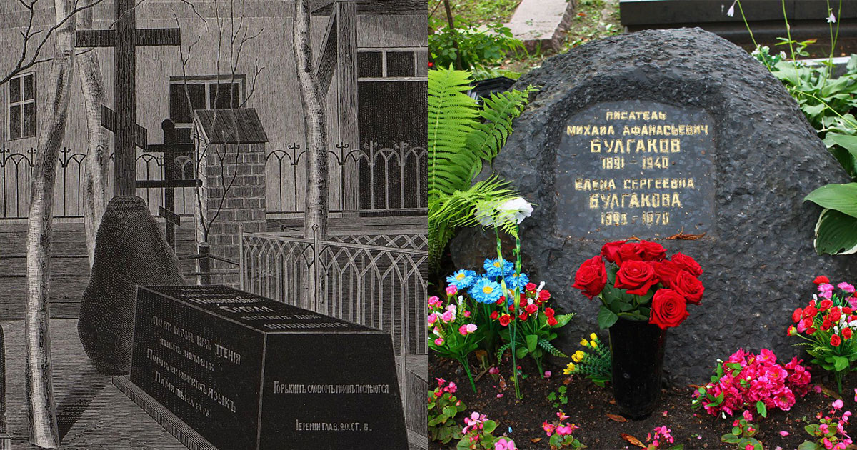 Первоначально на могиле Николая Гоголя на монастырском кладбище находился камень, получивший прозвище «Голгофа» из-за сходства с Иерусалимской горой. После решения о ликвидации кладбища при перезахоронении писателя на новом месте на его могиле установили бюст. Сам же камень впоследствии был перенесён на могилу Михаила Булгакова — по инициативе его жены. В этом контексте особенно примечательны слова Булгакова, которые он неоднократно обращал к Гоголю: «Учитель, укрой меня своей чугунной шинелью».