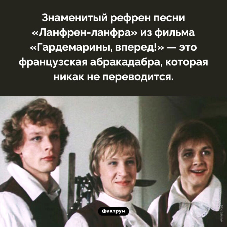 Знаменитый рефрен песни «Ланфрен-ланфра» из фильма «Гардемарины, вперед!» — это французская абракадабра, которая никак не переводится.