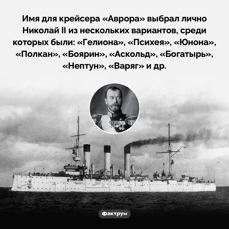 Имя для крейсера «Аврора» выбрал лично Николай II из нескольких вариантов, среди которых были: «Гелиона», «Психея», «Юнона», «Полкан», «Боярин», «Аскольд», «Богатырь», «Нептун», «Варяг» и др.