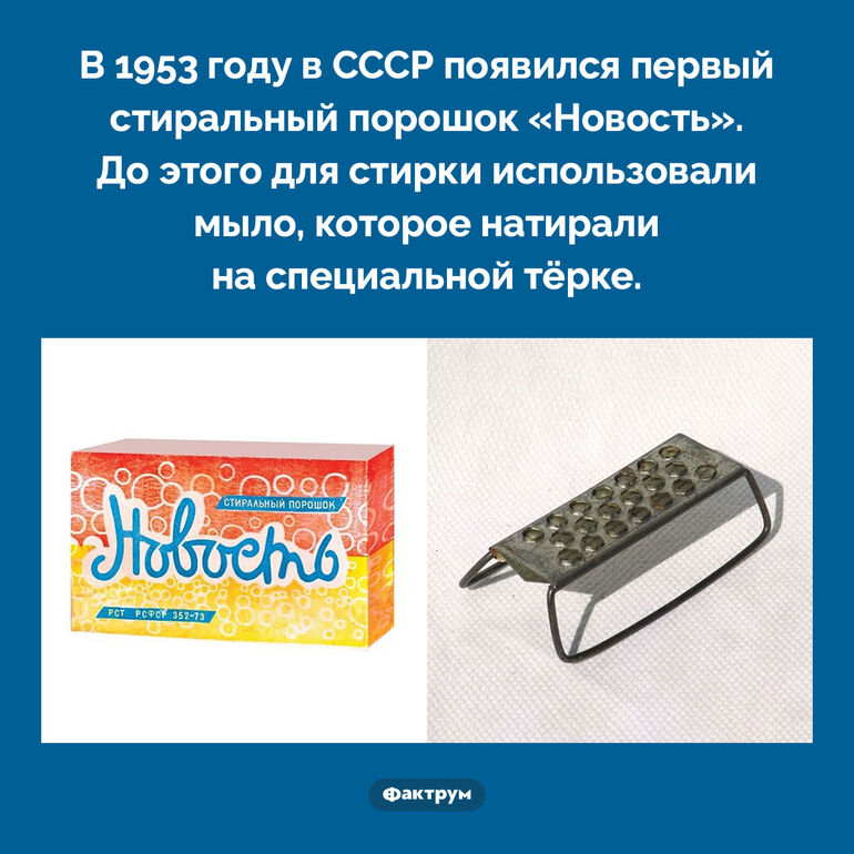 В 1953 году в СССР появился первый стиральный порошок «Новость». До этого для стирки использовали мыло, которое натирали на специальной тёрке.