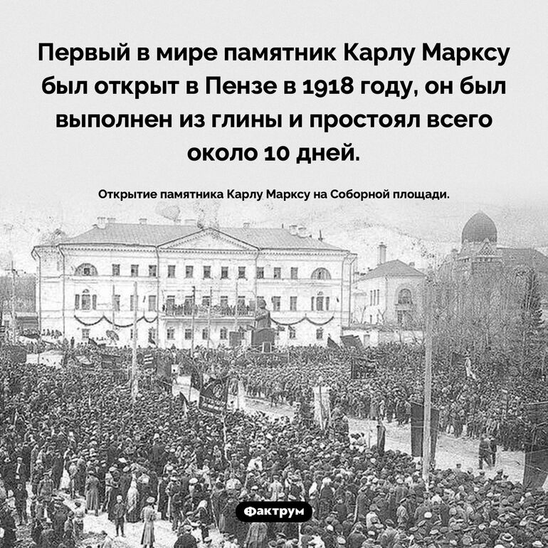 Первый в мире памятник Карлу Марксу был открыт в Пензе в 1918 году, он был выполнен из глины и простоял всего около 10 дней.