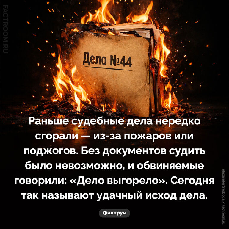 Раньше судебные дела нередко сгорали — из-за пожаров или поджогов. Без документов судить было невозможно, и обвиняемые говорили: «Дело выгорело». Сегодня так называют удачный исход дела.