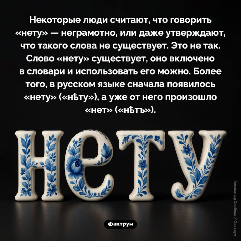 Некоторые люди считают, что говорить «нету» — неграмотно, или даже утверждают, что такого слова не существует. Это не так. Слово «нету» существует, оно включено в словари и использовать его можно. Более того, в русском языке сначала появилось «нету» («нѣту»), а уже от него произошло «нет» («нѣтъ»).