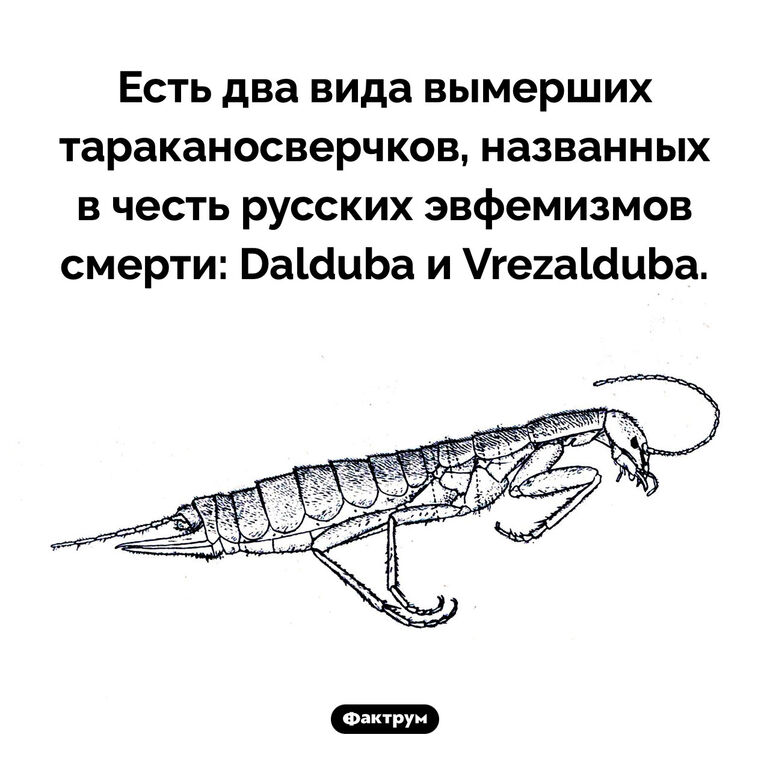 Есть два вида вымерших тараканосверчков, названных в честь русских эвфемизмов смерти: Dalduba и Vrezalduba.
