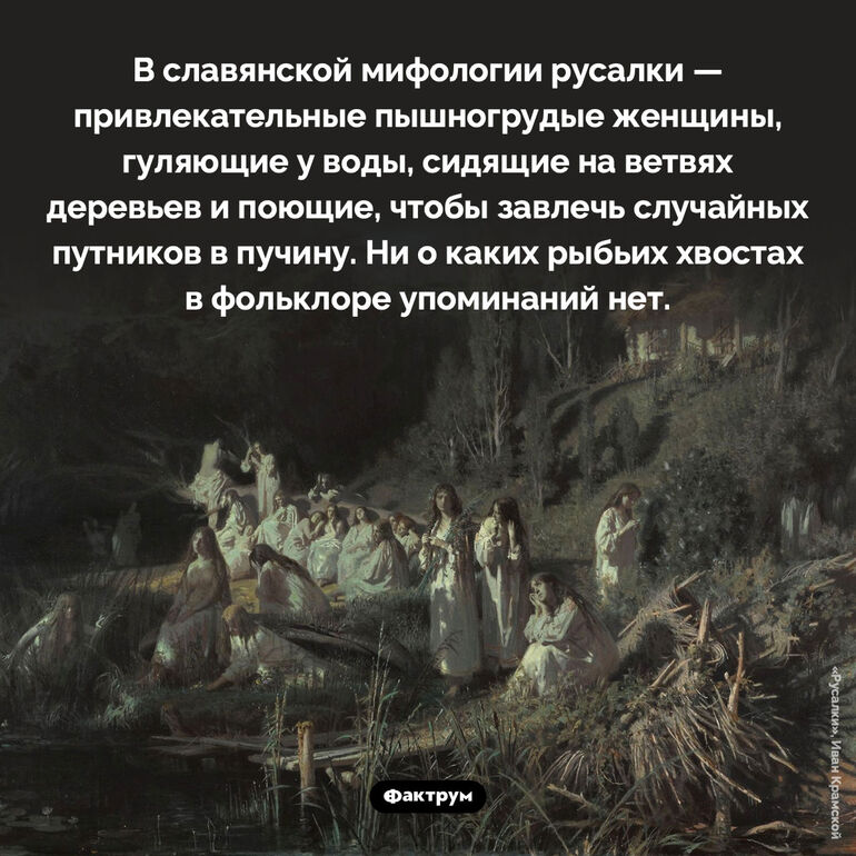 В славянской мифологии русалки — привлекательные пышногрудые женщины, гуляющие у воды, сидящие на ветвях деревьев и поющие, чтобы завлечь случайных путников в пучину. Ни о каких рыбьих хвостах в фольклоре упоминаний нет.