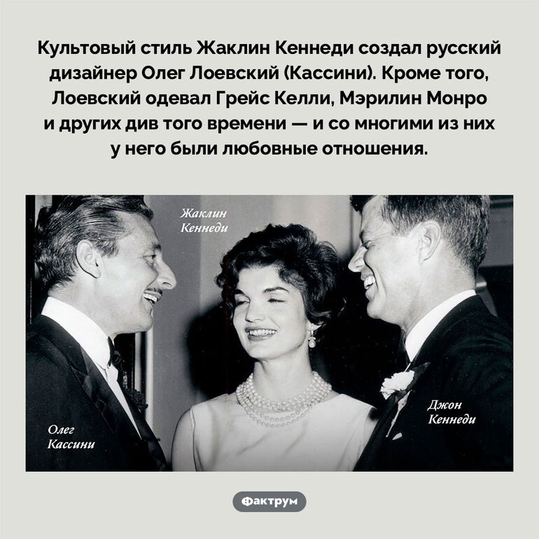 Культовый стиль Жаклин Кеннеди создал русский дизайнер Олег Лоевский (Кассини). Кроме того, Лоевский одевал Грейс Келли, Мэрилин Монро и других див того времени — и со многими из них у него были любовные отношения.